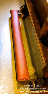 David assembles the new oak Reredos we designed and built for St. Marys Catholic church Oswaldtwistle. Jeanette paints the two side panels with angels to balance with the existing side altar of the Sacred Heart. The statue of the virgin and child was fire damaged, and restored by Jeanette and David.