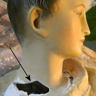 Their heads are so near to the size and shape of a rounded door knob, (designed to fit snugly in the hand) that the temptation to grasp the figure by the head for easy transport from store room to church proves irresistible...until the neck breaks.